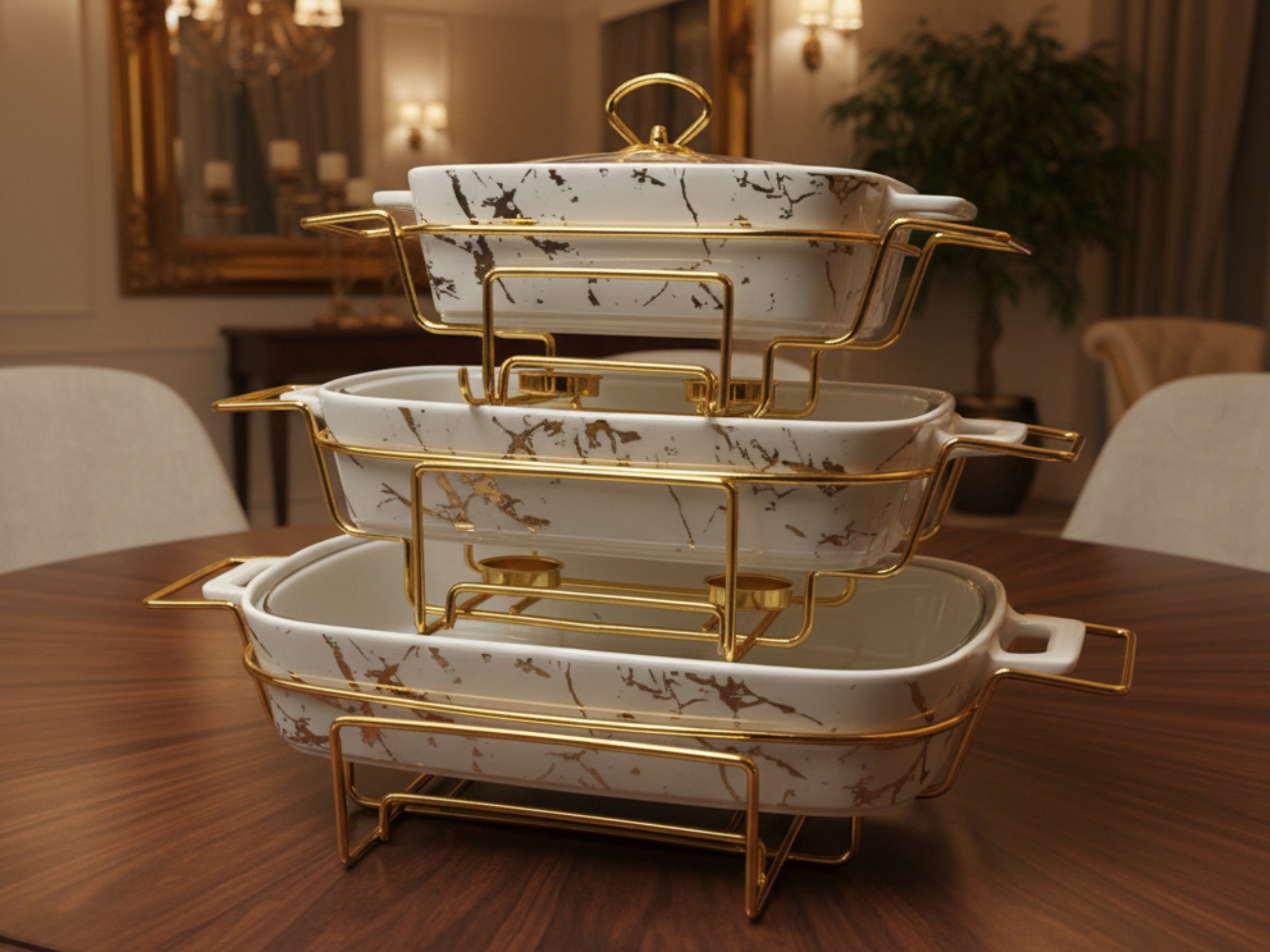 Elegant Twin Rectangular Chafing Dishes (11.5" each) with handles & Metal Stand – White Marble Buffet Set
