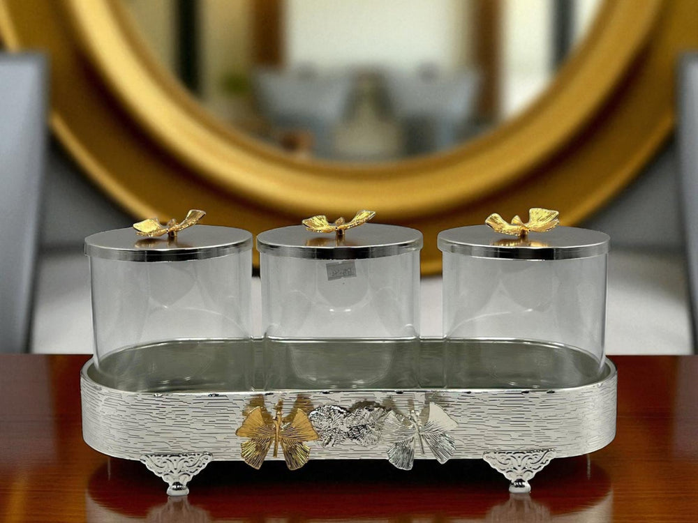 Bring grace to your home with this Elegant Gold & Silver 3-Pcs Candy Set. Crafted with crystal-clear jars and sleek silver lids adorned with delicate gold-toned butterfly handles, this set rests beautifully on a silver-embossed base accented with metallic butterflies. It’s where storage meets sophistication — ideal for sweets, nuts, tea, or even as a decorative centerpiece.