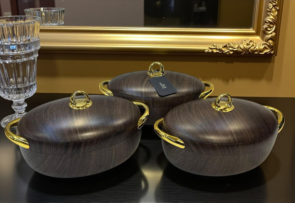 Experience the understated luxury of the Imported Forever Gold Oval Hot Pot Set in dark wooden textures. This sophisticated set of three combines exquisite craftsmanship with practical design, offering ample space and versatility for your culinary presentations. The rich dark wood finish adds warmth and elegance to any dining occasion, making it ideal for both everyday use and special gatherings.