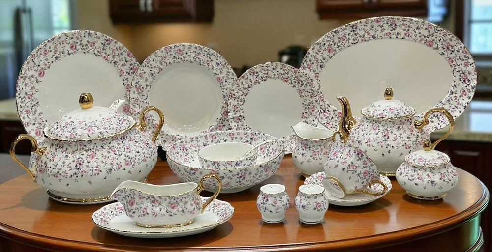 Elevate your dining experience with this Imported Luxury Royal Albert style 75-piece dinner set, crafted from fine bone china. Designed to serve eight, this exquisite collection combines timeless sophistication with durable materials for everyday use and special occasions. Each piece reflects expert craftsmanship, ensuring elegance and resilience that enhances your table setting with a classic touch.
