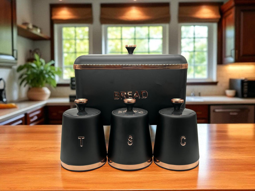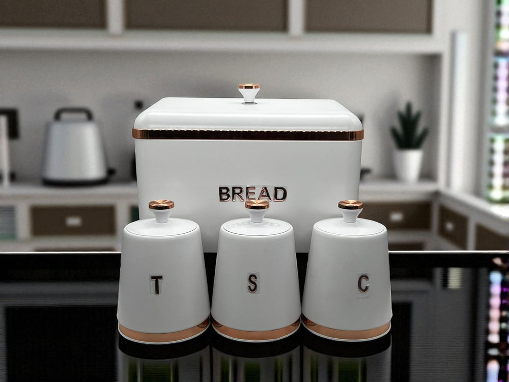 Upgrade your kitchen aesthetics with this luxurious 4-piece Bread & Canister Set. Designed in a sleek matte finish with elegant rose gold accents, this set is perfect for modern kitchens.