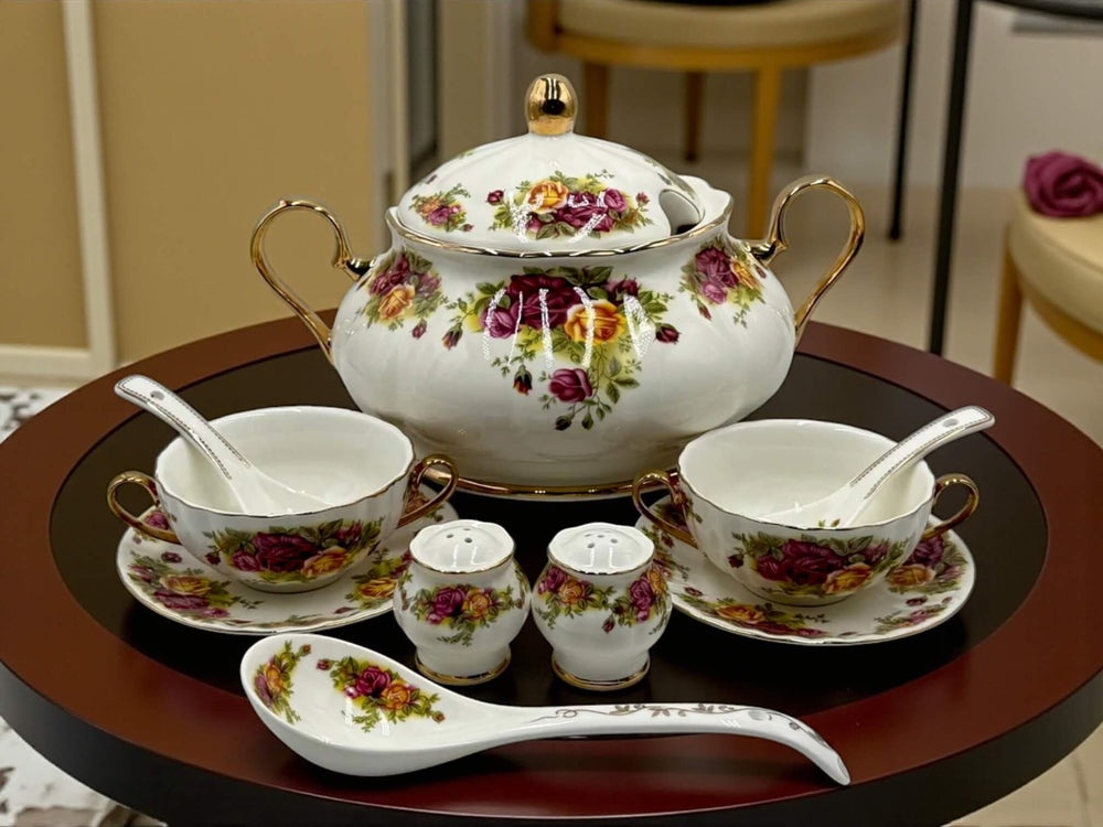 Dine in elegance with the Royal Albert–inspired 23 pcs soup set, crafted with intricate floral patterns and stunning golden detailing that bring timeless beauty to your table. Designed for both everyday use and special occasions, this set combines luxury, durability, and heritage-inspired charm to make every meal feel royal.